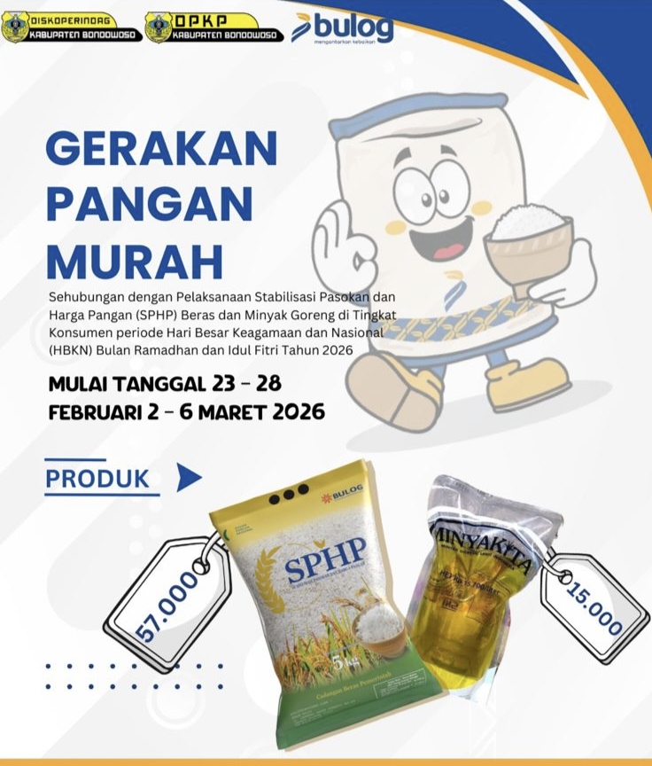 Bondowoso, BULETININDO.COM – Pemerintah kembali menggelar Gerakan Pangan Murah (GPM) sebagai upaya menjaga stabilitas pasokan dan harga pangan di tingkat konsumen menjelang Hari Besar Keagamaan Nasional (HBKN) Ramadhan dan Idul Fitri 2026.
